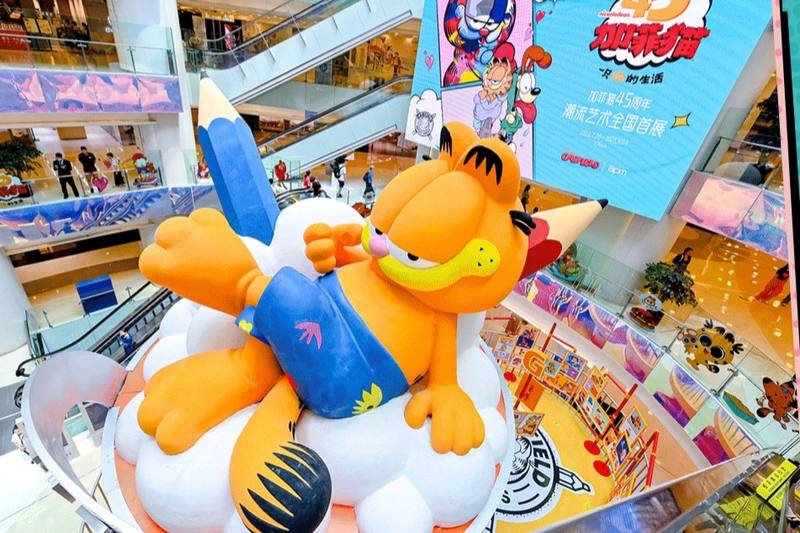 在北京apm首層中庭,一只憨態(tài)可掬的加菲貓吸引了眾多消費(fèi)者駐足打卡。“北京apm×加菲貓45周年潮流藝術(shù)全國首展”近日啟幕,展覽攜手8位當(dāng)代藝術(shù)家,以不同潮流元素為超人氣IP加菲貓變裝,打造8款潮流新形象。整個(gè)展區(qū)共分為室內(nèi)和室外三大區(qū)域,可愛、慵懶、個(gè)性十足的加菲貓隨處可見。