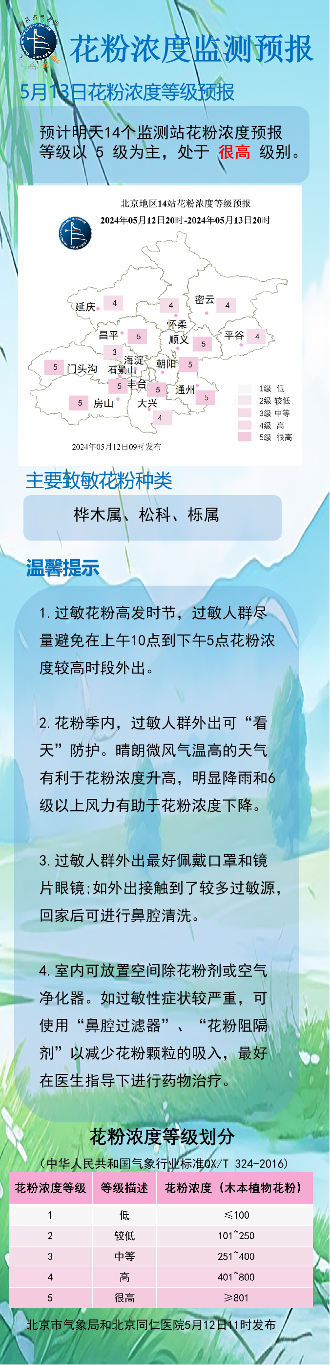 新京報(bào)訊 5月12日,北京市氣象局發(fā)布花粉濃度監(jiān)測(cè)預(yù)報(bào),預(yù)計(jì)5月13日北京地區(qū)花粉濃度處于很高級(jí)別。