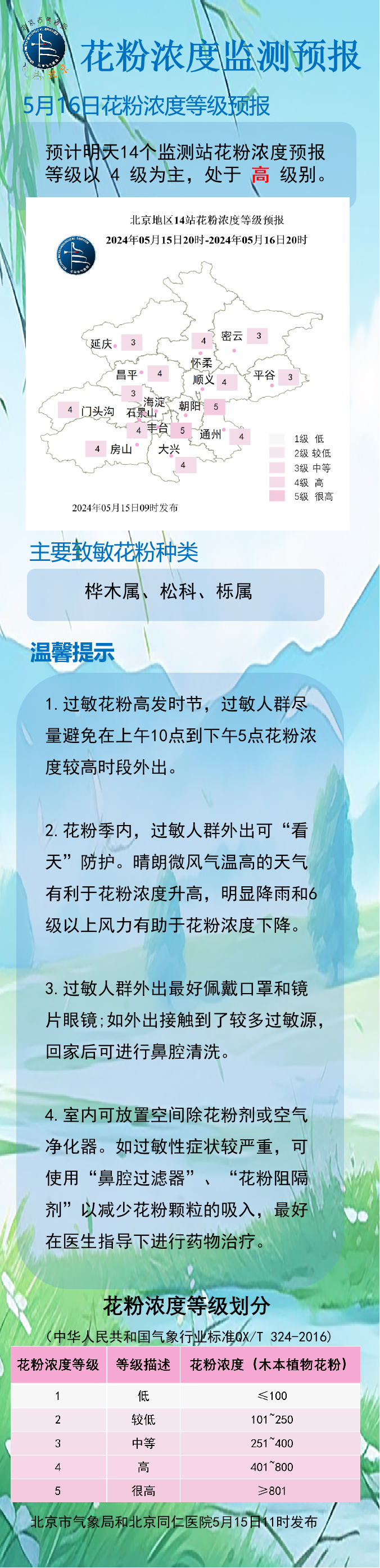 新京報(bào)訊 5月15日,北京市氣象局發(fā)布花粉濃度監(jiān)測(cè)預(yù)報(bào),預(yù)計(jì)5月16日北京市花粉濃度以4級(jí)為主,處于高級(jí)別。