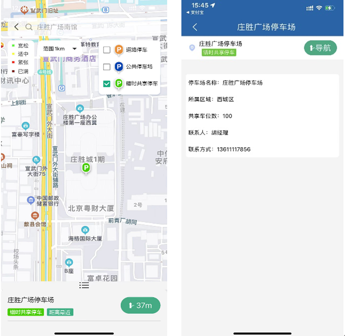 前期,市交通委會同各區(qū)停車管理部門梳理了我市有償錯時共享停車場信息,并推動北京交通APP更新改版。停車人使用“北京交通”APP“停車服務(wù)”的地圖查詢功能時,即可看到“錯時共享停車”專題圖層,輸入目的地后可查詢周邊有償錯時共享停車場信息,具體信息包括:有償錯時共享停車場名稱和位置、共享車位數(shù)、聯(lián)系人及聯(lián)系方式等,停車人可撥打聯(lián)系電話咨詢共享停車具體辦理事宜。此外,還可一鍵導(dǎo)航至有償共享停車場,方便停車人提前規(guī)劃出行時間和出行路線。