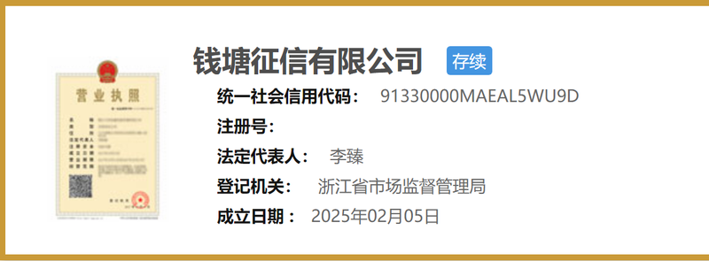 國家企業(yè)信用信息公示系統(tǒng)顯示,錢塘征信成立日期為2025年2月5日,注冊地為浙江省杭州市西湖區(qū),注冊資本為人民幣10億元。