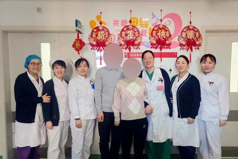 產(chǎn)婦(右四)和丈夫與醫(yī)護(hù)人員合影。