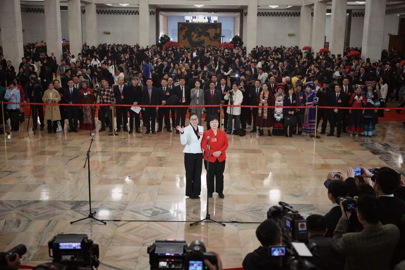 3月8日,人民大會(huì)堂,十四屆全國(guó)人大三次會(huì)議第二場(chǎng)“代表通道”上,全國(guó)人大代表?xiàng)顚毩幔ㄓ遥⑹⒑耄ㄗ螅┮黄鹱E麄児?jié)日快樂(lè)。