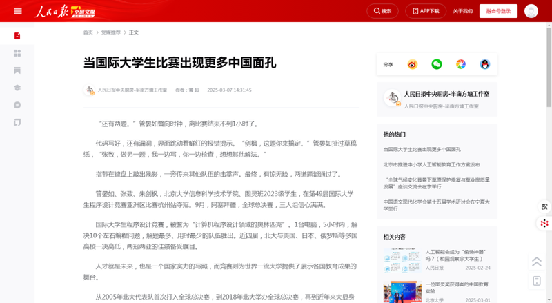 培養(yǎng)什么人、怎樣培養(yǎng)人、為誰培養(yǎng)人是教育的根本問題。3月7日,《人民日報》兩會特刊以“新時代中國何以平視世界”為題,深度解析奮斗的中國,前進的中國,自信的中國……在人才培養(yǎng)篇中,安徽師范大學(xué)附屬中學(xué)(下稱附中)2023屆優(yōu)秀畢業(yè)生、北京大學(xué)圖靈班學(xué)子朱劍楓與隊友在國際大學(xué)生程序設(shè)計競賽(ICPC)亞洲區(qū)杭州站力拔頭籌的捷報,躍然特刊版面。這不僅是朱劍楓同學(xué)的個人榮耀,更是附中優(yōu)質(zhì)教育成果的生動寫照。