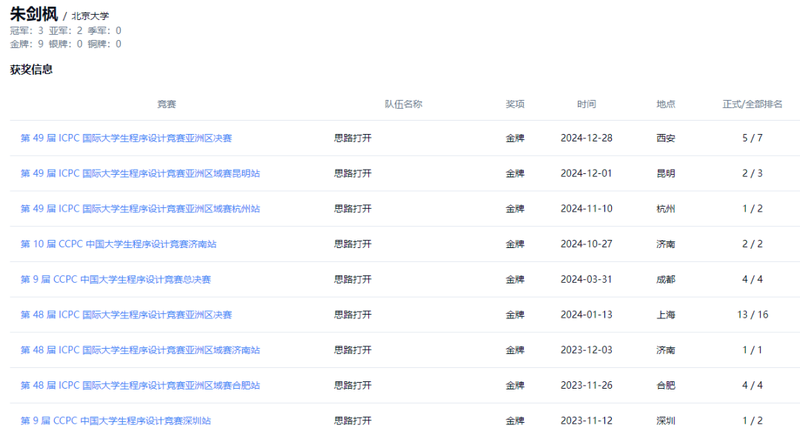 朱劍楓高中期間即展現(xiàn)出卓越的信息學(xué)天賦,憑借全國信息學(xué)奧賽金牌入選國家集訓(xùn)隊,于2023年保送北京大學(xué)圖靈班。在北大就讀期間,他與隊友在第49屆ICPC國際大學(xué)生程序設(shè)計競賽亞洲區(qū)分站賽中斬獲杭州站冠軍,并在昆明站獲亞軍,帶領(lǐng)團隊多次登頂國際賽事金獎領(lǐng)獎臺。