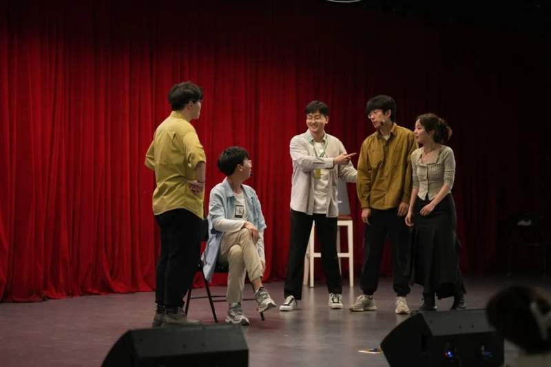 開放麥的場地是一間沒有固定陳設(shè)的教室,椅子隨意散布著,似乎還能看到上一場活動的影子。而在不到半小時的布場后,便有了紅色幕布前的舞臺、弧形排列的觀眾席、調(diào)試好的音響和燈光。一切都是那么精巧,幾乎具備了沉浸式表演現(xiàn)場的所有元素。