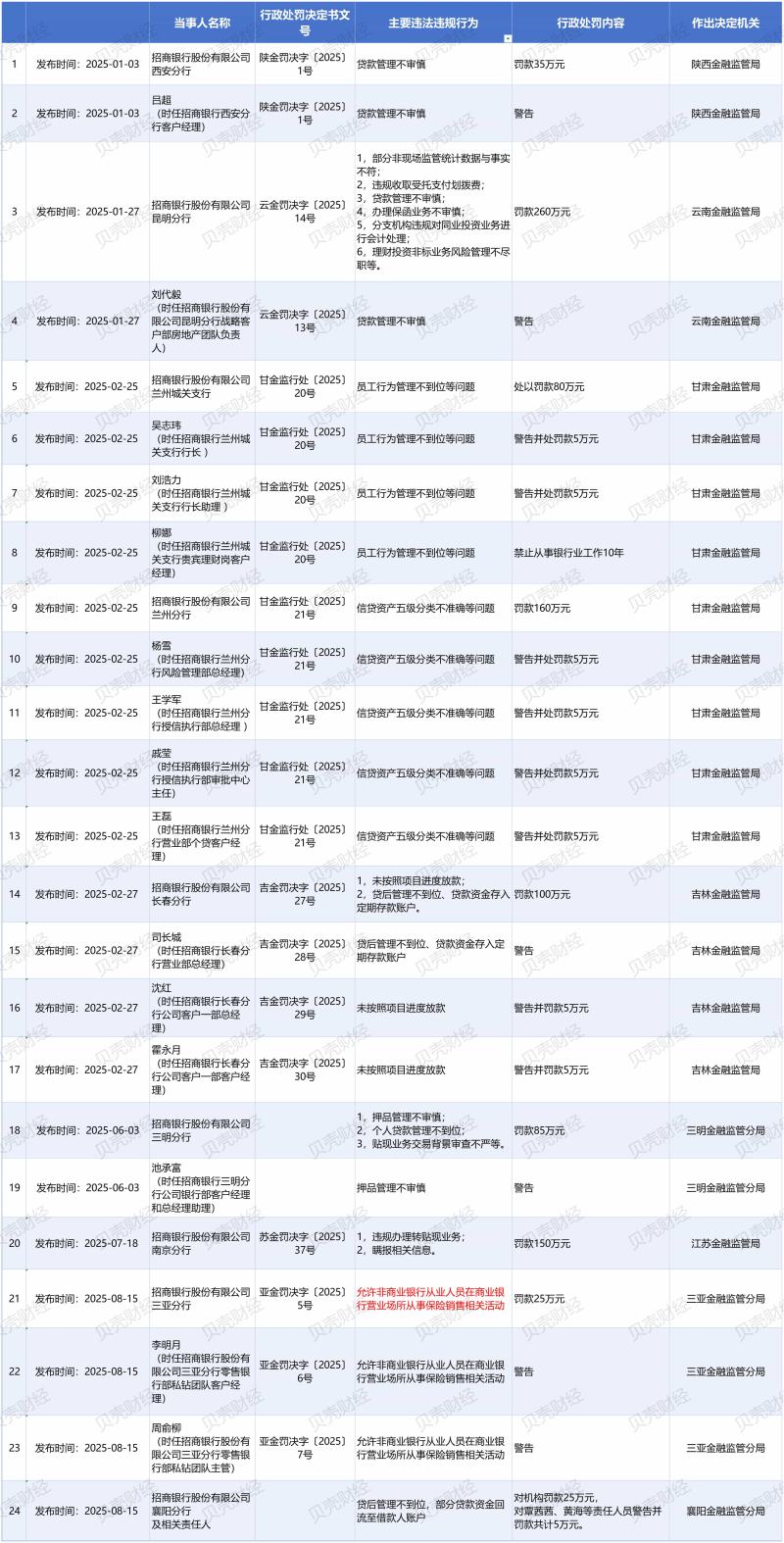 但8月15日同天4張罰單被公示,并非招行年內(nèi)罰單最密集、處罰最重的一次。