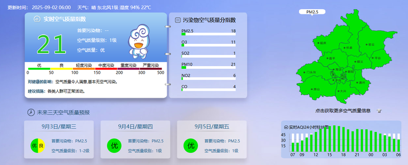 據(jù)北京市生態(tài)環(huán)境監(jiān)測中心今早7時(shí)數(shù)據(jù),目前實(shí)時(shí)空氣質(zhì)量指數(shù)21,空氣質(zhì)量優(yōu)。