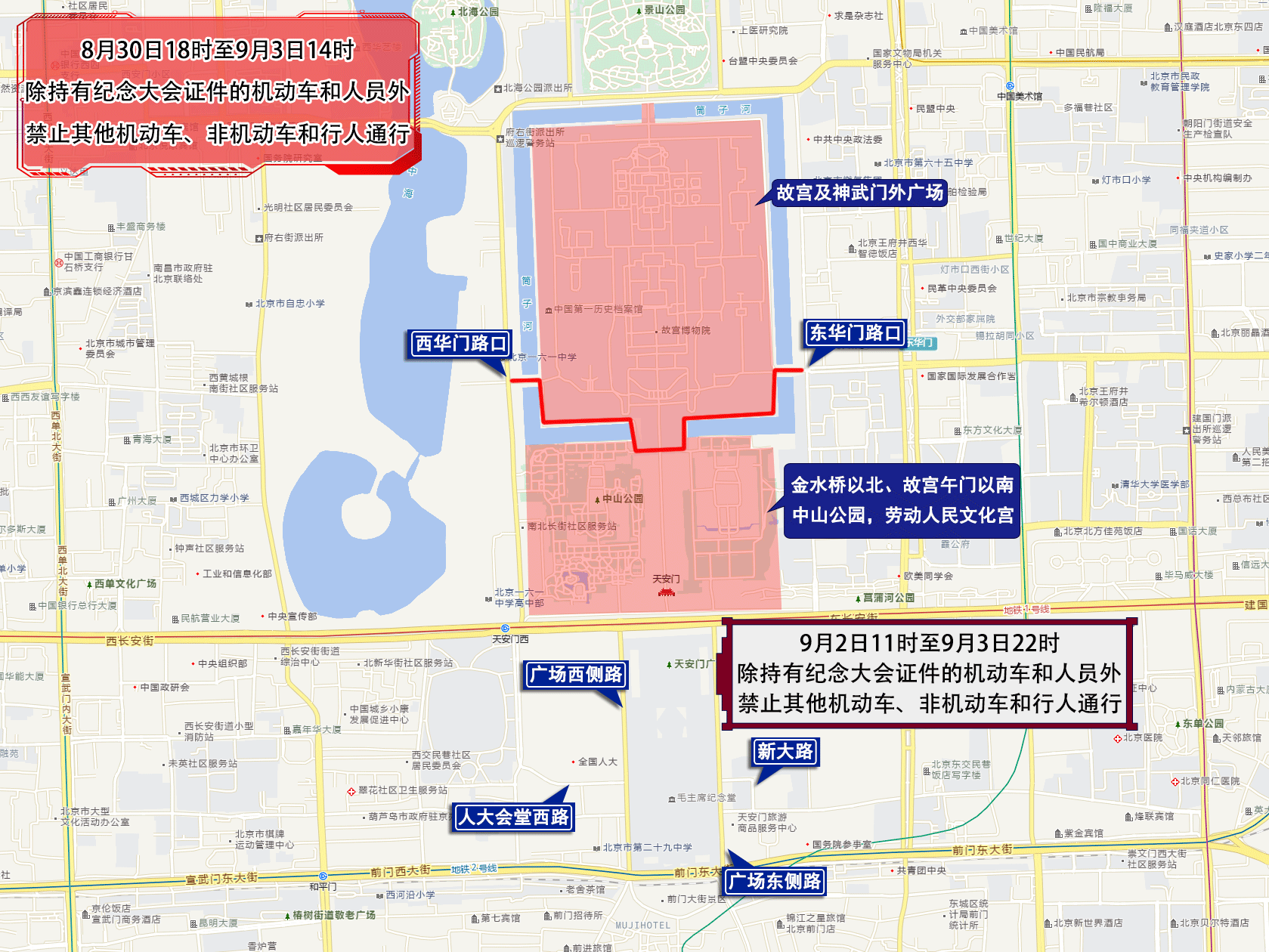 9月2日11時(shí)至9月3日22時(shí),廣場東側(cè)路,廣場西側(cè)路,人大會堂西路,新大路,除持有紀(jì)念大會證件的機(jī)動(dòng)車和人員外,禁止其他機(jī)動(dòng)車、非機(jī)動(dòng)車和行人通行。詳情>>>
