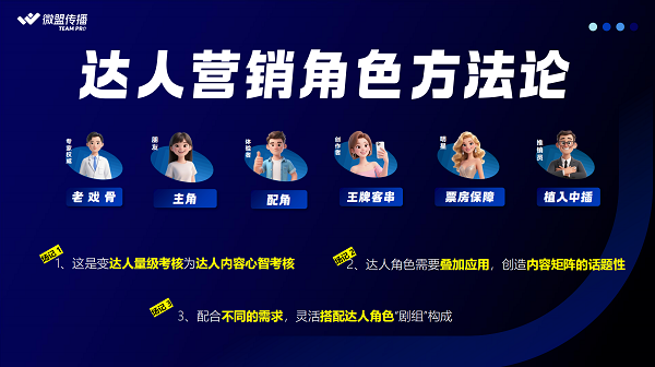 最后,我想強(qiáng)調(diào):角色時(shí)代的達(dá)人營銷,本質(zhì)是一場“戰(zhàn)略思維”的轉(zhuǎn)變:當(dāng)流量逐漸退居次要位置,“合適的角色”與“優(yōu)質(zhì)的內(nèi)容”成為核心,營銷也從“購買注意力”轉(zhuǎn)向“創(chuàng)造共鳴力”。期待未來,客戶能從“關(guān)注達(dá)人價(jià)格”轉(zhuǎn)向“關(guān)注角色匹配度”,與微盟傳播TEAM PRO攜手,共同打造以“共鳴”為核心的營銷好戲。我們也愿以全域資源與服務(wù)能力,成為各位真正的生意伙伴。在粉塵化多觸點(diǎn)營銷環(huán)境下,和客戶一起解決問題,達(dá)成結(jié)果!謝謝大家!