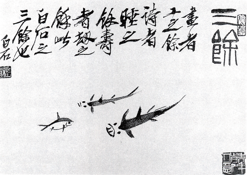 名滿天下的齊白石也曾畫了三條小魚,名之曰《三余圖》,這是中國的諧音妙用,“魚”“余”同音,便假借通用。他在上面題字云:“畫者工之余,詩者睡之余,壽者劫之余,此白石之三余也。”——一片閑適從容氣象。