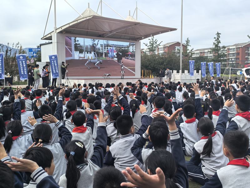 招手、跳躍、倒立,伴隨著臺上的機器狗做出各種動作,臺下的小學(xué)生們不時“哇”聲一片……10月11日下午,在北京市海淀區(qū)教科院和平未來實驗小學(xué)的操場上,以“智啟童心科創(chuàng)夢 探秘科技寶葫蘆”為主題的人工智能實踐課程實施暨科學(xué)節(jié)活動正在開展。