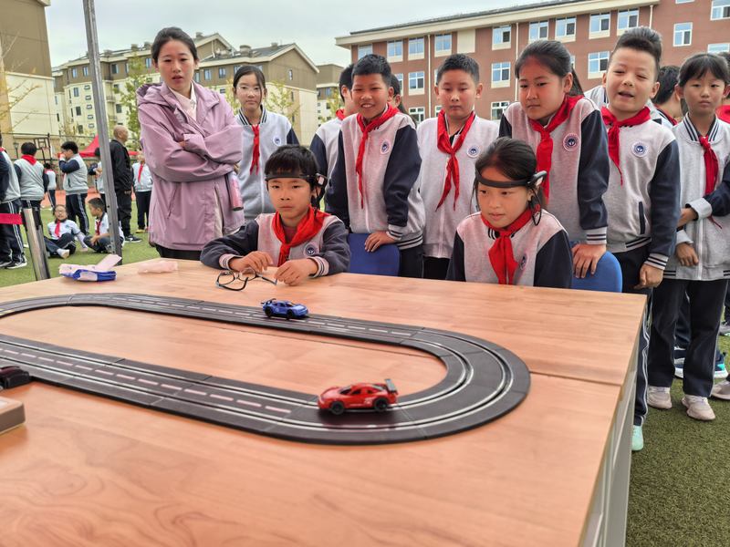 在參加腦波賽車體驗項目前,五年級5班學(xué)生呂暢和同學(xué)們戴上一個特殊的傳感裝置,眼睛緊盯著桌子上的兩輛小賽車,不一會兒兩輛賽車就追趕起來?!案杏X特別神奇!”率先集中意念讓賽車啟動,呂暢對這次體驗十分滿意,“我腦子里一直想著‘小車快跑’,然后車就跑起來了。太好玩了!”該體驗項目的負責(zé)老師解釋,大腦在各種活動狀態(tài)下會產(chǎn)生不同的腦電波,這些腦電波由頭戴的腦波儀探測到,然后腦波儀通過無線裝置將收集到的電信號傳遞到賽車處理器上,賽車接收到信號,經(jīng)處理后控制動力模塊的運作,這樣賽車就可以動起來了。