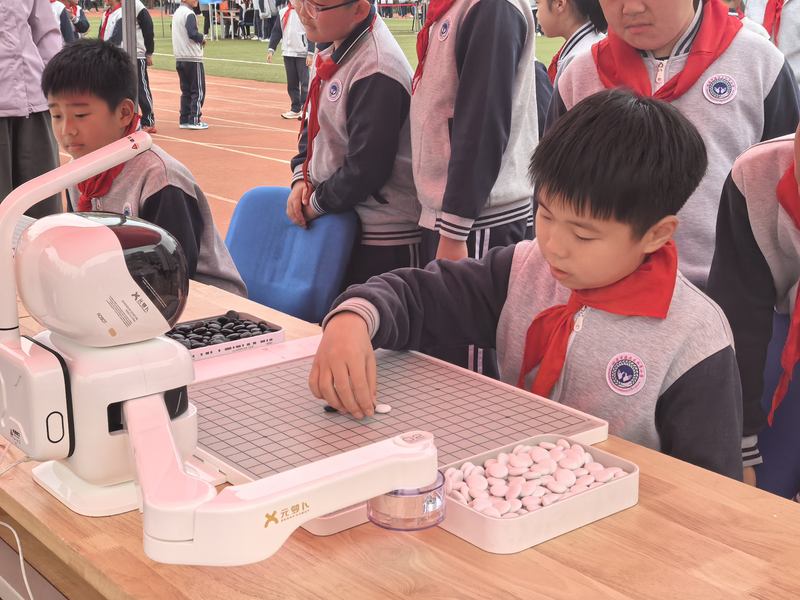 下午1點,記者在學(xué)??吹?,各種科技項目在操場四周依次排開,學(xué)生們排隊體驗。除了G1機器人與機器狗聯(lián)動表演以及科學(xué)魔法秀外,現(xiàn)場還設(shè)計了“幻境尋蹤”VR/AR體驗區(qū) 、“機巧洞天”AI與機器人區(qū)、“聲光奇域”跨學(xué)科實踐區(qū)以及“匠心工坊”科技制作區(qū)四大區(qū)域,包括VR飛機、寫字機器人、智能射擊、下棋機器人等十余個科技體驗項目。在教室里,學(xué)生們則在老師的帶領(lǐng)下,用材料包學(xué)習(xí)制作避障機器人和“航母發(fā)射器”。
