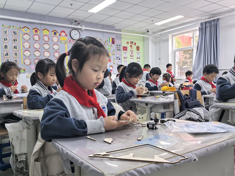 教室里,三年級學(xué)生學(xué)習(xí)制作避障機器人。新京報記者楊菲菲 攝