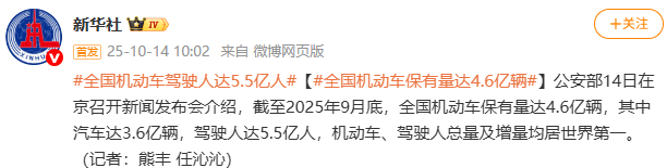 據(jù)新華社微博消息,公安部14日在京召開新聞發(fā)布會介紹,截至2025年9月底,全國機(jī)動車保有量達(dá)4.6億輛,其中汽車達(dá)3.6億輛,駕駛?cè)诉_(dá)5.5億人,機(jī)動車、駕駛?cè)丝偭考霸隽烤邮澜绲谝?。(記者:熊豐 任沁沁)