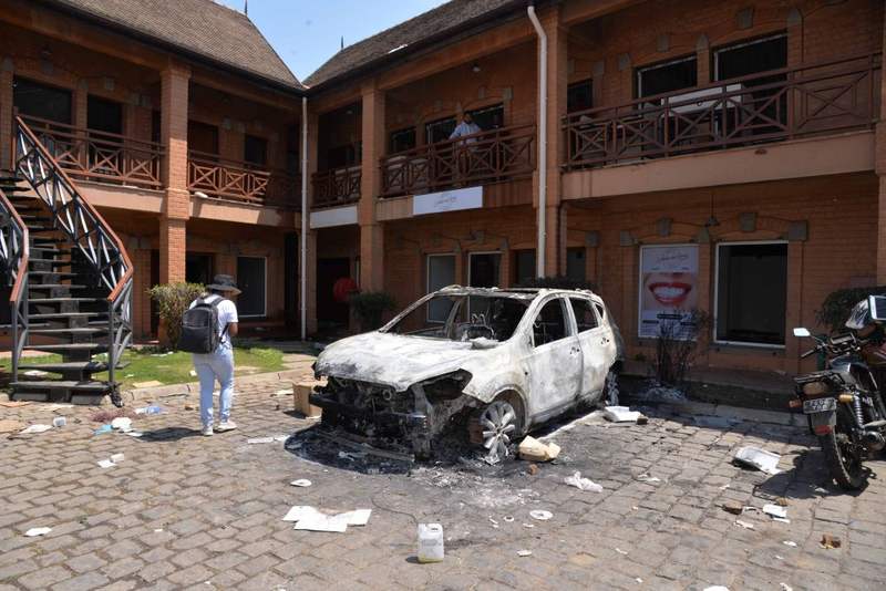 這是9月26日在馬達加斯加塔那那利佛商業(yè)區(qū)拍攝的被損壞的汽車和商鋪。新華社發(fā)(西塔卡·拉喬納里松攝)