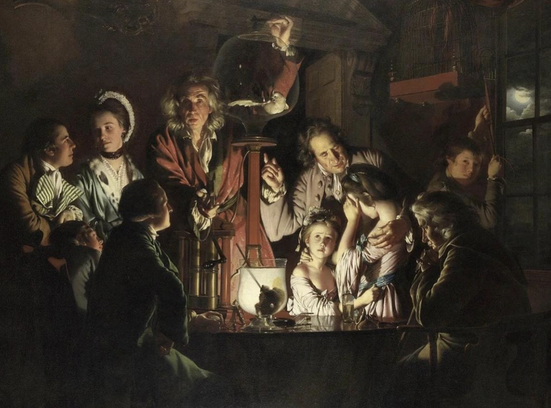 18世紀(jì),約瑟夫·賴(lài)特作品《氣泵里的鳥(niǎo)實(shí)驗(yàn)》(An Experiment on a Bird in the Air Pump)局部。
