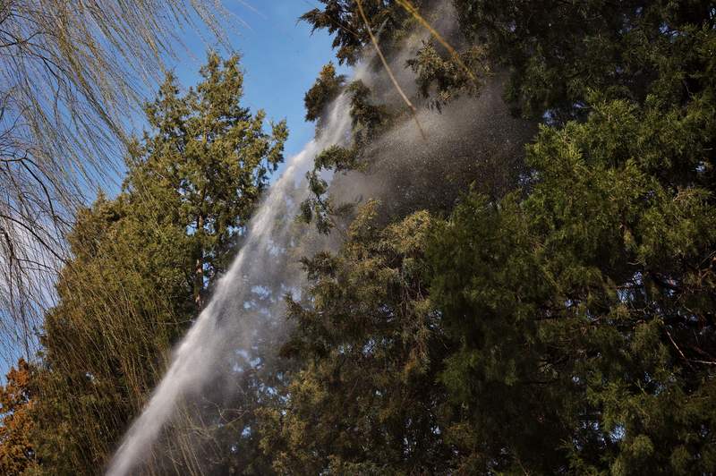 高壓水槍噴灑到檜柏上,以減少花粉飄散量。資料圖片/新京報(bào)記者 薛珺 攝