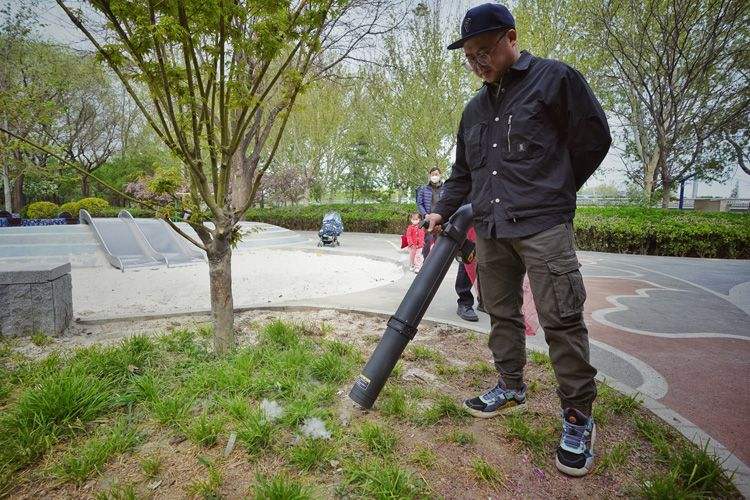 工作人員正在使用輕便手提式楊柳飛絮吸收機(jī)。資料圖片/新京報(bào)記者 薛珺 攝