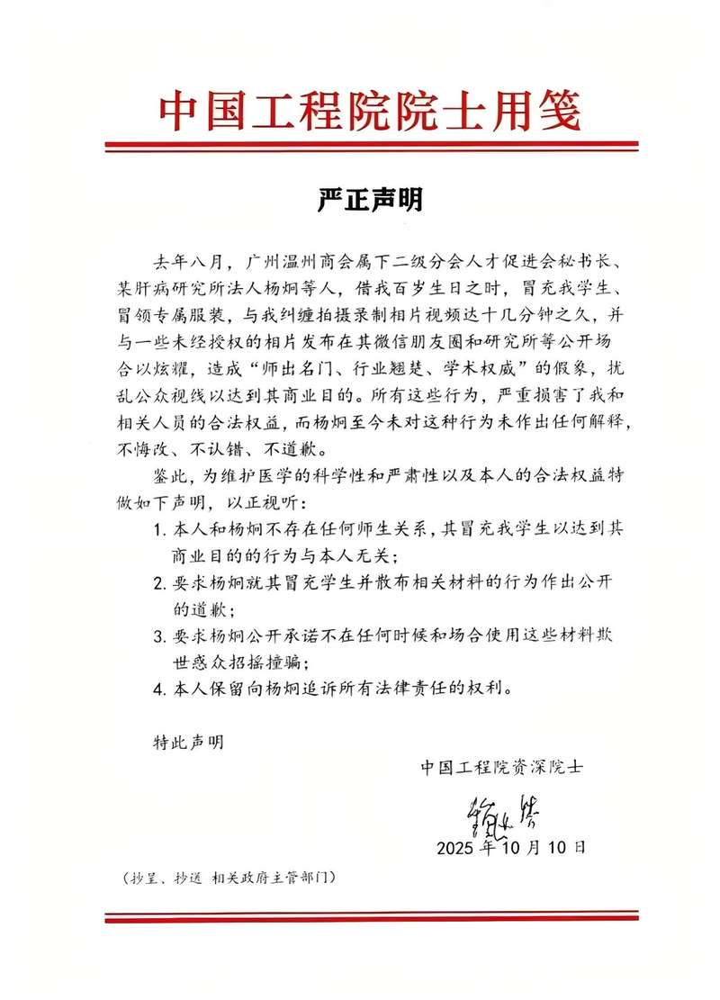 10月11日,一份由百歲院士手書簽字并委托發(fā)布的“嚴正聲明”,將一場“冒用師門、蹭合影”的爭議推至臺前。