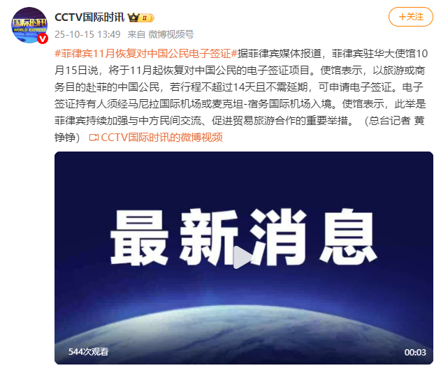 據(jù)@CCTV國際時訊消息,據(jù)菲律賓媒體報道,菲律賓駐華大使館10月15日說,將于11月起恢復(fù)對中國公民的電子簽證項目。使館表示,以旅游或商務(wù)目的赴菲的中國公民,若行程不超過14天且不需延期,可申請電子簽證。電子簽證持有人須經(jīng)馬尼拉國際機場或麥克坦-宿務(wù)國際機場入境。使館表示,此舉是菲律賓持續(xù)加強與中方民間交流、促進貿(mào)易旅游合作的重要舉措。(總臺記者 黃錚錚)