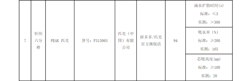 2022年8月,在對(duì)部分吸濕速干類(lèi)服裝、防曬類(lèi)服裝、冰袖及帽子等86個(gè)品牌樣品開(kāi)展比較試驗(yàn)后,北京市消費(fèi)者協(xié)會(huì)發(fā)布“吸濕速干防紫外線服裝比較試驗(yàn)結(jié)果”。其中,PEAK匹克一款針織六分褲不符合標(biāo)準(zhǔn),問(wèn)題指向滴水?dāng)U散時(shí)間、吸水率以及芯吸高度。