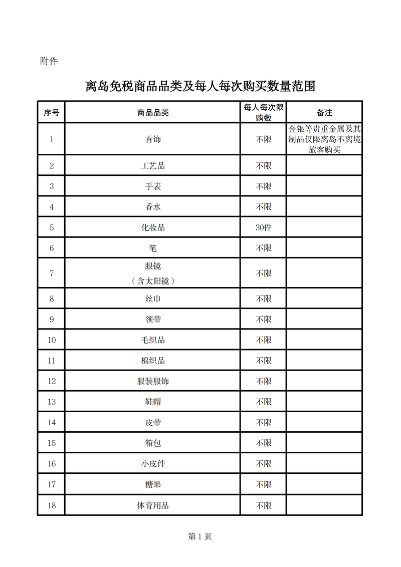調(diào)整后離島免稅商品共47類,具體品類、購買數(shù)量、備注要求見附件,并按此執(zhí)行。
