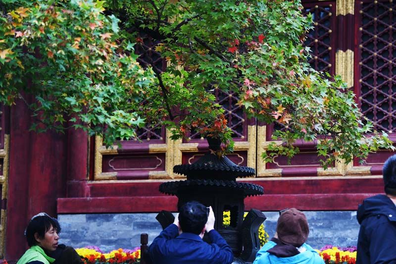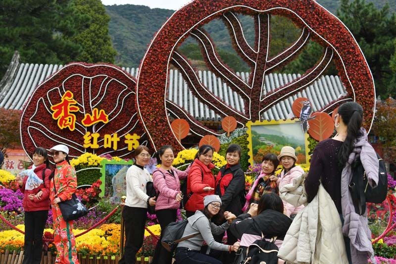 10月16日,香山紅葉節(jié)正式拉開(kāi)帷幕,目前全園平均紅葉變色指數(shù)已達(dá)10%,部分向陽(yáng)區(qū)域變色明顯。圖為游客在花壇前留影。