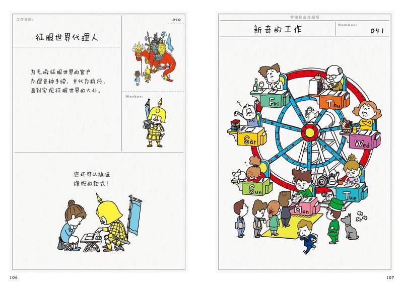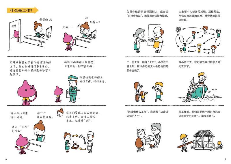 一個外星人迫降在地球回不去了,他決定先找份工作,在地球上好好生活??墒恰肮ぷ鳌笔鞘裁??要去哪里找呢?外星人走進(jìn)了一家神奇的職業(yè)介紹所,這里的工作人員給他介紹了44個新奇的工作——拋高高慶祝員、洗手液種植戶、故事摩天輪管理員、超時(shí)空搬家員……外星人會選什么工作呢?