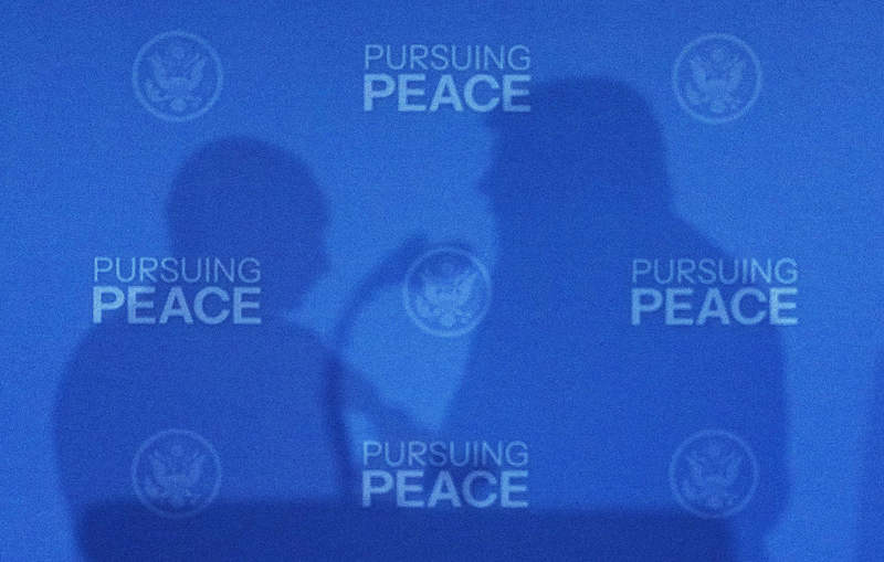 8月15日,美國總統(tǒng)特朗普(右)與俄羅斯總統(tǒng)普京在美國阿拉斯加州安克雷奇市埃爾門多夫-理查森聯(lián)合軍事基地舉行會晤后共同出席聯(lián)合記者會時身影映在現(xiàn)場。新華社記者吳曉凌攝