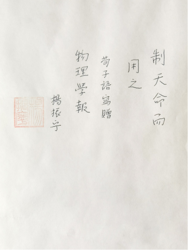 2003年,為慶祝中國物理學(xué)會主辦的《物理學(xué)報》創(chuàng)刊70周年,楊振寧為該刊題寫“制天命而用之”。受訪者供圖