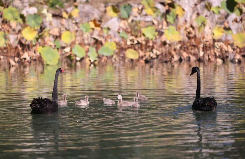 10月19日,清華園水木清華,清華園的黑天鵝夫婦帶著它們今年的第三窩寶寶游弋在水面上。六只可愛的黑天鵝寶寶成為清華園秋日里一道亮麗風(fēng)景線。