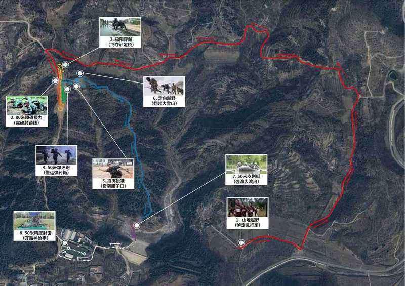 全天賽事共計(jì)6小時(shí),午間休息2小時(shí),融合山地武裝越野、軍事體育和長(zhǎng)征歷史戰(zhàn)役元素,設(shè)置瀘定急行軍(2.4公里山地越野)、突破封鎖線(80米障礙接力)、飛奪瀘定橋(極限穿越)、搬運(yùn)彈藥箱(50米加速跑)、奇襲臘子口(投擲投準(zhǔn))、翻越大雪山(定向越野)、強(qiáng)渡大渡河(50米皮劃艇)、開路神槍手(50米精度射擊)等8個(gè)項(xiàng)目?jī)?nèi)容,突出賽事普及性、專業(yè)性、安全性、趣味性和觀賞性。全部8個(gè)項(xiàng)目用時(shí)約40分鐘。