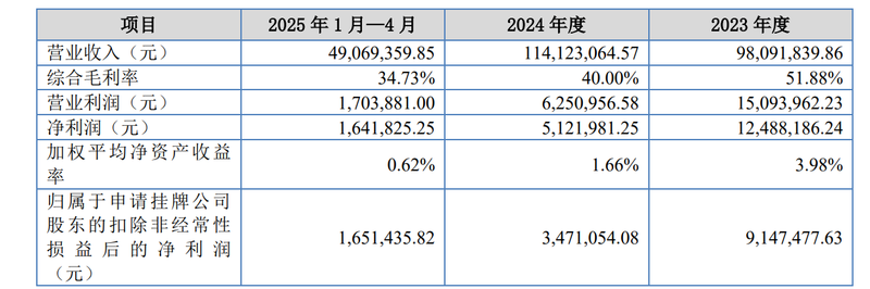 從業(yè)績表現(xiàn)來看,2023年、2024年以及2025年1月-4月,安華生物分別實現(xiàn)營業(yè)收入9809.18萬元、1.14億元和4906.94萬元,該公司指出,2024年較2023年實現(xiàn)16.34%的增長,主要得益于公司功能性護(hù)膚品和醫(yī)療終端產(chǎn)品業(yè)務(wù)的發(fā)展。與營業(yè)收入相比,安華生物的凈利潤較為波動,各報告期內(nèi)凈利潤分別約1248.82萬元、512.2萬元和164.18萬元,其中,受成本、研發(fā)費用均有所上升等因素影響,該公司2024年的凈利潤同比下滑了58.99%。