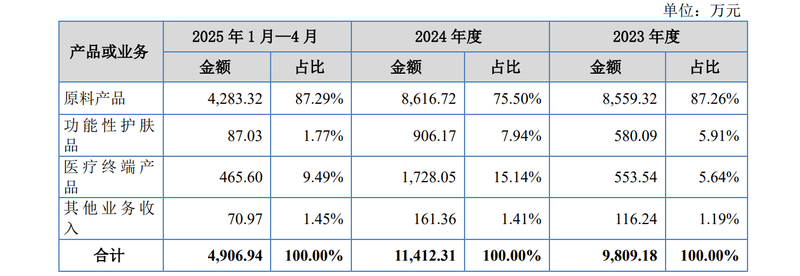 按業(yè)務(wù)劃分,安華生物的收入主要來自原料產(chǎn)品、功能性護(hù)膚品、醫(yī)療終端產(chǎn)品及其他業(yè)務(wù)。