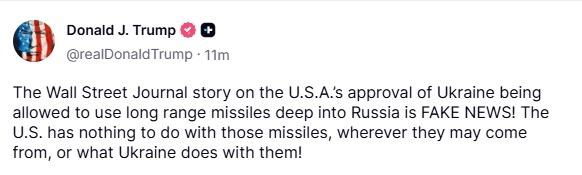 據(jù)央視新聞消息,當(dāng)?shù)貢r(shí)間10月22日,美國(guó)總統(tǒng)特朗普在社交平臺(tái)上發(fā)文表示,《華爾街日?qǐng)?bào)》關(guān)于“美國(guó)批準(zhǔn)烏克蘭使用西方國(guó)家提供的遠(yuǎn)程導(dǎo)彈打擊俄羅斯本土縱深目標(biāo)”的報(bào)道是假新聞。