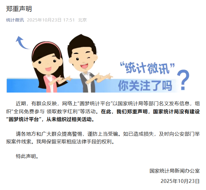 新京報訊 10月23日,國家統(tǒng)計局新聞辦公室發(fā)布鄭重聲明:近期,有群眾反映,網(wǎng)絡上“圓夢統(tǒng)計平臺”以國家統(tǒng)計局等部門名義發(fā)布信息,組織“全民免費參與 領取數(shù)字紅利”等活動。在此,我們鄭重聲明,國家統(tǒng)計局沒有建設“圓夢統(tǒng)計平臺”,從未組織過相關活動。