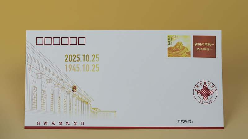 新京報訊(記者吳婷婷)10月25日,由中共中央臺灣工作辦公室監(jiān)制,中國集郵有限公司特發(fā)行《臺灣光復(fù)紀(jì)念日》紀(jì)念封一套一枚,貼《長城》個性化服務(wù)專用郵票,印紀(jì)念戳,售價3.2元。