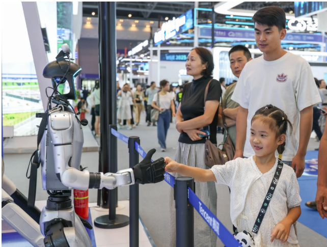 ▲9月8日,在2025世界智能產(chǎn)業(yè)博覽會現(xiàn)場,一人形機(jī)器人與小朋友握手。圖/新華社