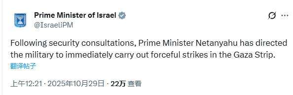 △以總理辦公室社交媒體賬戶發(fā)布消息稱,以總理內(nèi)塔尼亞胡已命令以軍立即襲擊加沙地帶。
