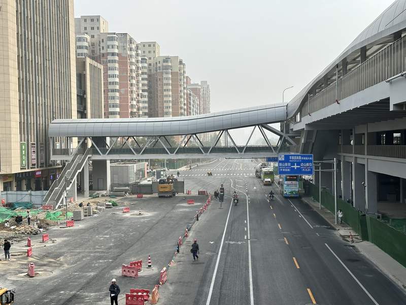 蘋果園綜合交通樞紐南北橫跨阜石路、蘋果園南路、蘋果園路等三條道路,空中用連廊銜接。新京報記者 王貴彬 攝