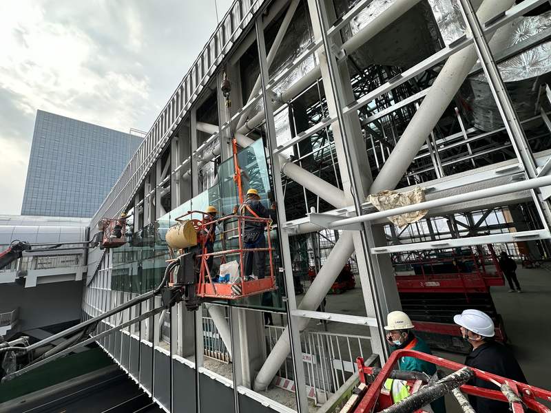 10月30日上午,蘋果園綜合交通樞紐內(nèi),工人正在安裝換乘廊道內(nèi)的玻璃外墻。新京報記者 王貴彬 攝