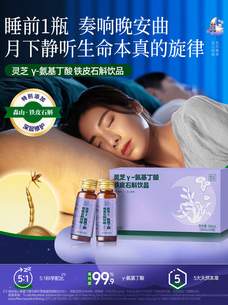 森山食養(yǎng)的一款靈芝γ-氨基丁酸鐵皮石斛飲品在介紹中多次表示與睡眠相關(guān)。根據(jù)詳情頁(yè)面,“舒壓助眠,酣睡整晚,睡前30分飲&晚安更輕松。雙重因子,強(qiáng)力助眠。5:1科學(xué)配比,打破入眠困境,降低睡眠潛伏期,延長(zhǎng)睡眠時(shí)間。”
