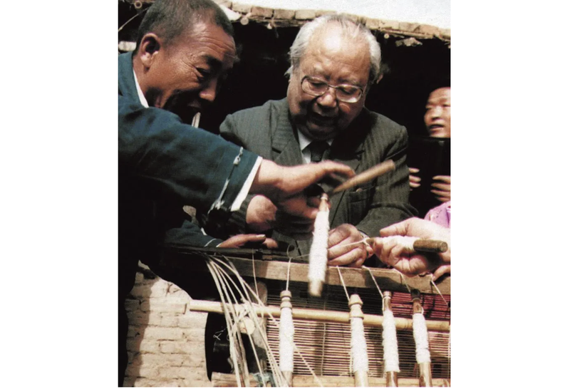 1991年,費(fèi)孝通在河北廣宗大東村農(nóng)民家了解竹簾生產(chǎn)情況。圖片來源于中國(guó)民主同盟網(wǎng)站。