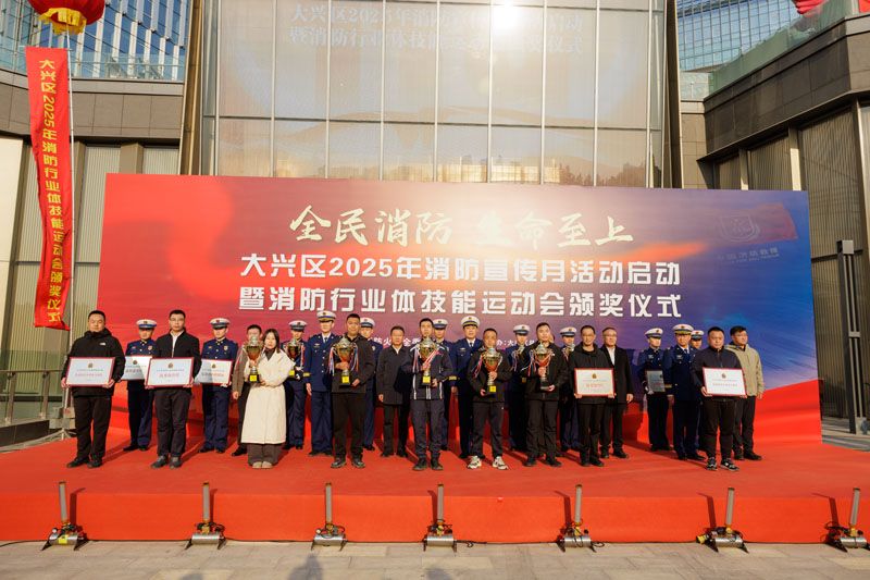 11月3日,大興區(qū)2025年消防宣傳月活動啟動暨消防行業(yè)體技能運(yùn)動會頒獎儀式在上德銀泰城廣場舉行。今年宣傳月主題是“全民消防,生命至上——安全用火用電”。大興區(qū)總工會、區(qū)應(yīng)急管理局、區(qū)消防救援局等區(qū)消防安全委員會成員單位相關(guān)領(lǐng)導(dǎo),各街鎮(zhèn)分管消防工作的領(lǐng)導(dǎo)以及消防志愿者、市民群眾近500人出席活動。圖為與會領(lǐng)導(dǎo)為消防行業(yè)體技能運(yùn)動會獲獎人員頒獎。
