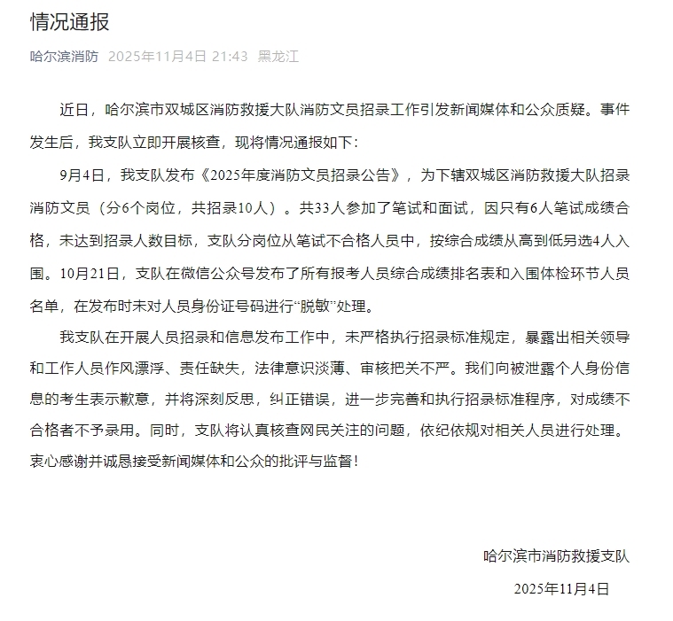 9月4日,我支隊發(fā)布《2025年度消防文員招錄公告》,為下轄雙城區(qū)消防救援大隊招錄消防文員(分6個崗位,共招錄10人)。共33人參加了筆試和面試,因只有6人筆試成績合格,未達(dá)到招錄人數(shù)目標(biāo),支隊分崗位從筆試不合格人員中,按綜合成績從高到低另選4人入圍。10月21日,支隊在微信公眾號發(fā)布了所有報考人員綜合成績排名表和入圍體檢環(huán)節(jié)人員名單,在發(fā)布時未對人員身份證號碼進(jìn)行“脫敏”處理。