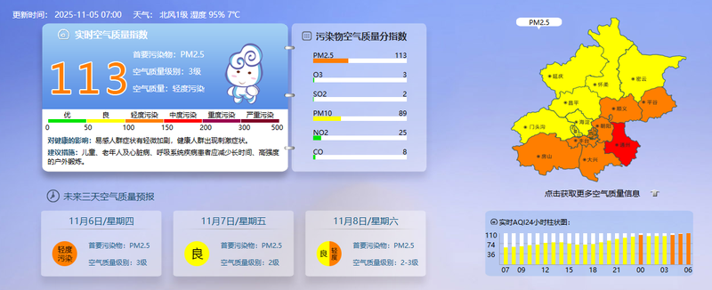 據(jù)北京市生態(tài)環(huán)境監(jiān)測(cè)中心今早7時(shí)數(shù)據(jù),目前實(shí)時(shí)空氣質(zhì)量指數(shù)113,空氣質(zhì)量輕度污染。