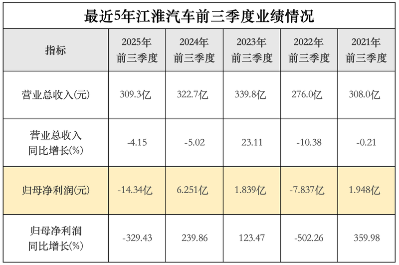 2025年第三季度,江淮汽車實現(xiàn)營業(yè)收入115.13億元,同比增長5.54%;歸屬于上市公司股東的凈利潤為-6.61億元,同比暴跌303.95%。前三季度,江淮汽車共實現(xiàn)營業(yè)收入308.73億元,同比下降4.14%;歸屬于上市公司股東的凈利潤為-14.34億元,同比轉(zhuǎn)虧。