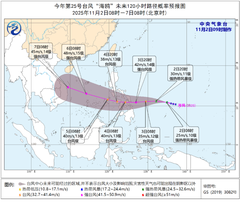 新京報(bào)訊 據(jù)自然資源部國(guó)家海洋預(yù)報(bào)臺(tái)消息,今年第25號(hào)臺(tái)風(fēng)“海鷗”昨夜(11月4日)穿過(guò)菲律賓中部,今天清晨進(jìn)入南海東南部海面,強(qiáng)度將再度加強(qiáng),最強(qiáng)可達(dá)強(qiáng)臺(tái)風(fēng)級(jí)。預(yù)計(jì)“海鷗”將繼續(xù)以每小時(shí)20公里左右的速度向偏西方向移動(dòng),預(yù)計(jì)6日夜間在越南中部沿海登陸,隨后逐漸減弱。